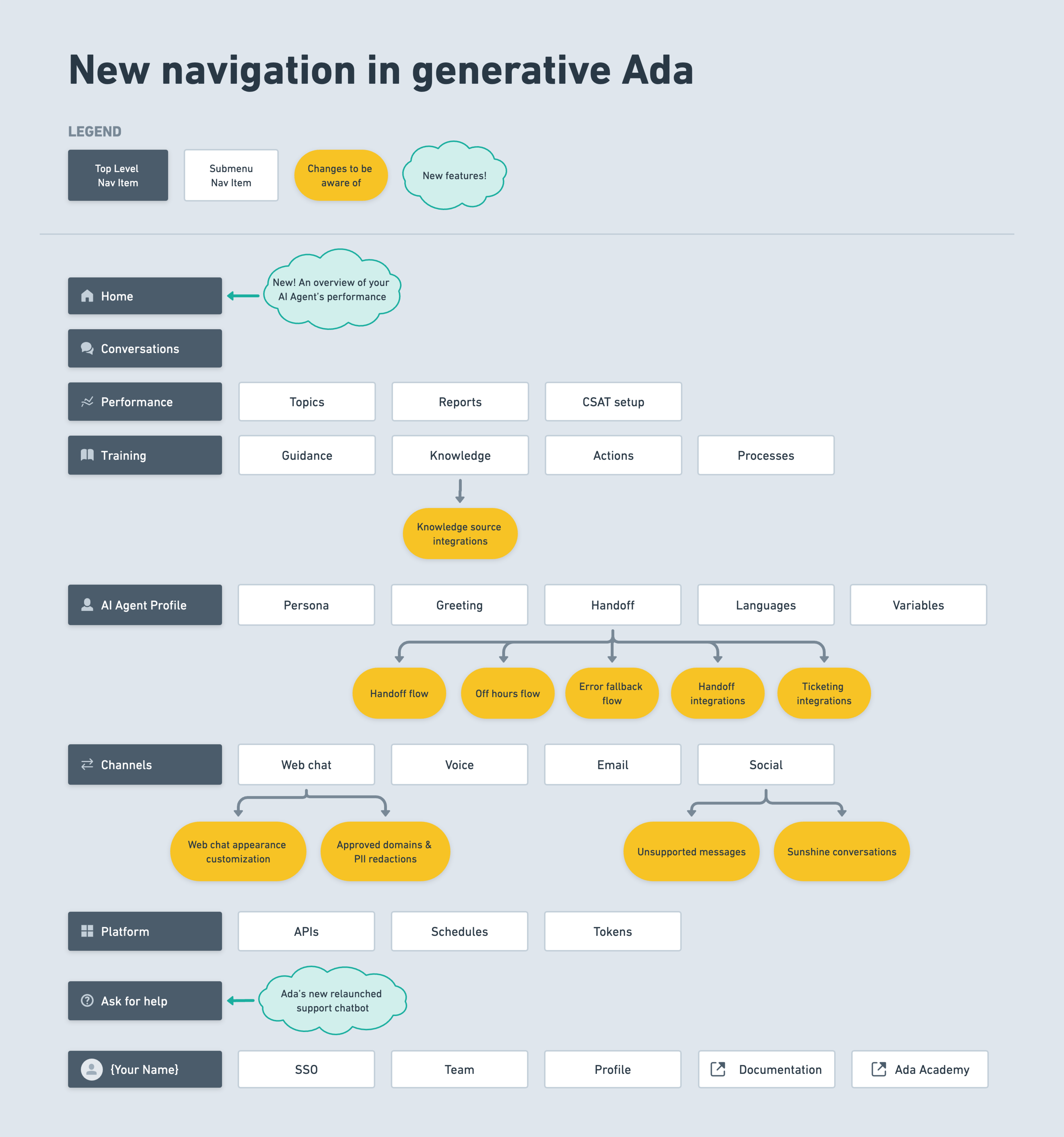 We’re thrilled to unveil a redesigned navigation for the generative Ada dashboard, aimed at improving the user experience and providing intuitive access to new and improved features. Below, we've detailed the updates grouped into key areas for your convenience.